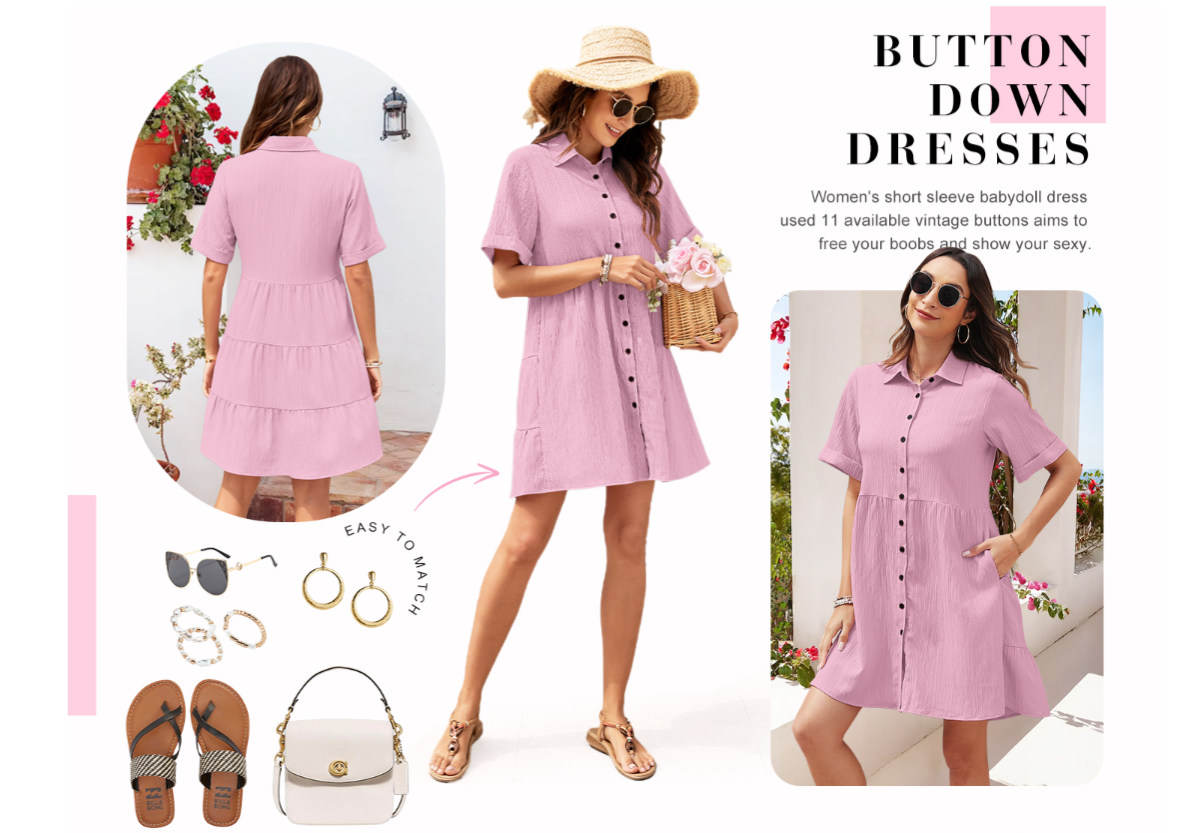 PYGFEMR Women's Summer Dress 2025 Short Sleeve Babydoll Tiered Button Down T Shirts Dresses with Pockets